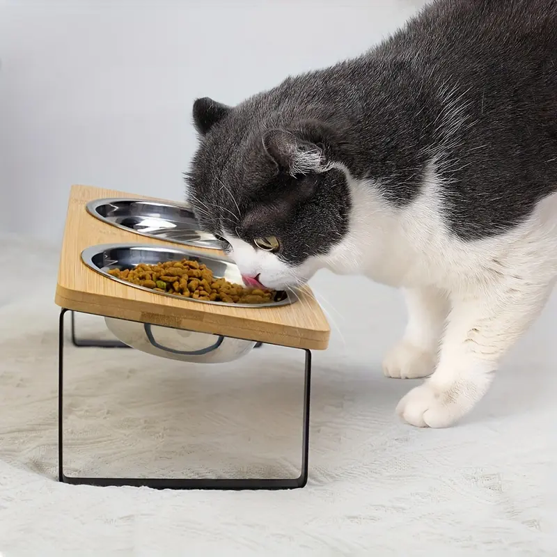 This elevated cat feeding station is designed to hold food and water bowls at a raised angle for everyday feeding and drinking. The set includes a stand with two stainless steel bowls for wet or dry food and water. The tilted layout helps keep the bowls positioned for consistent access during use. The components are designed for straightforward assembly and routine cleaning.