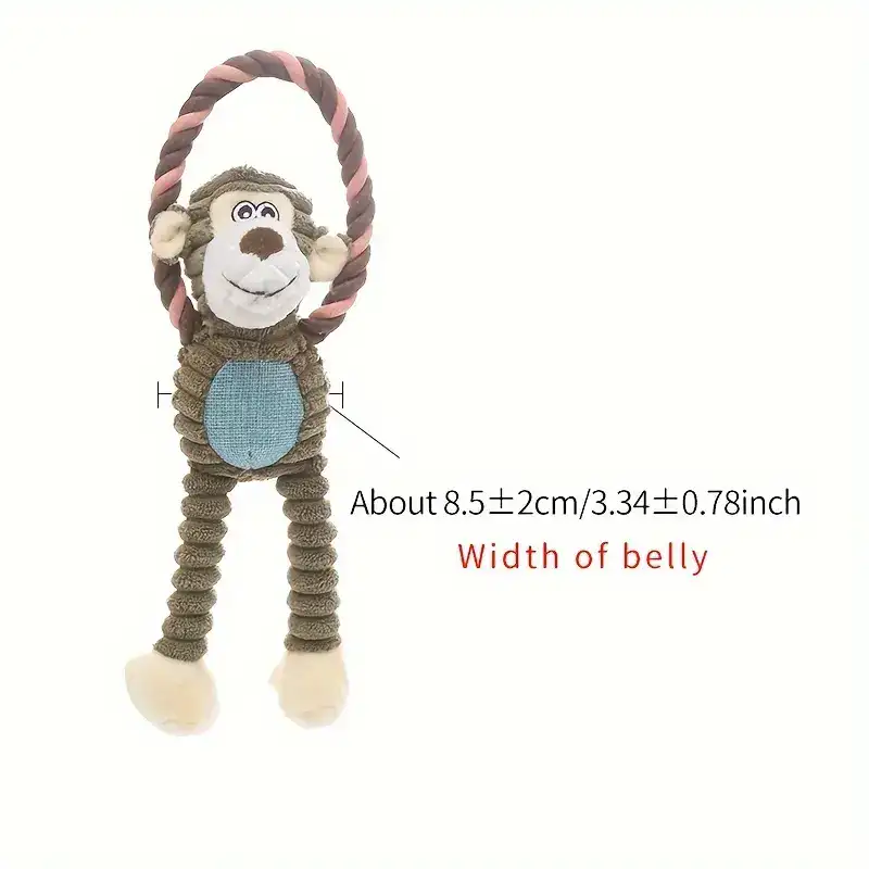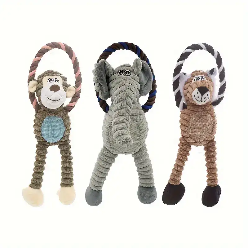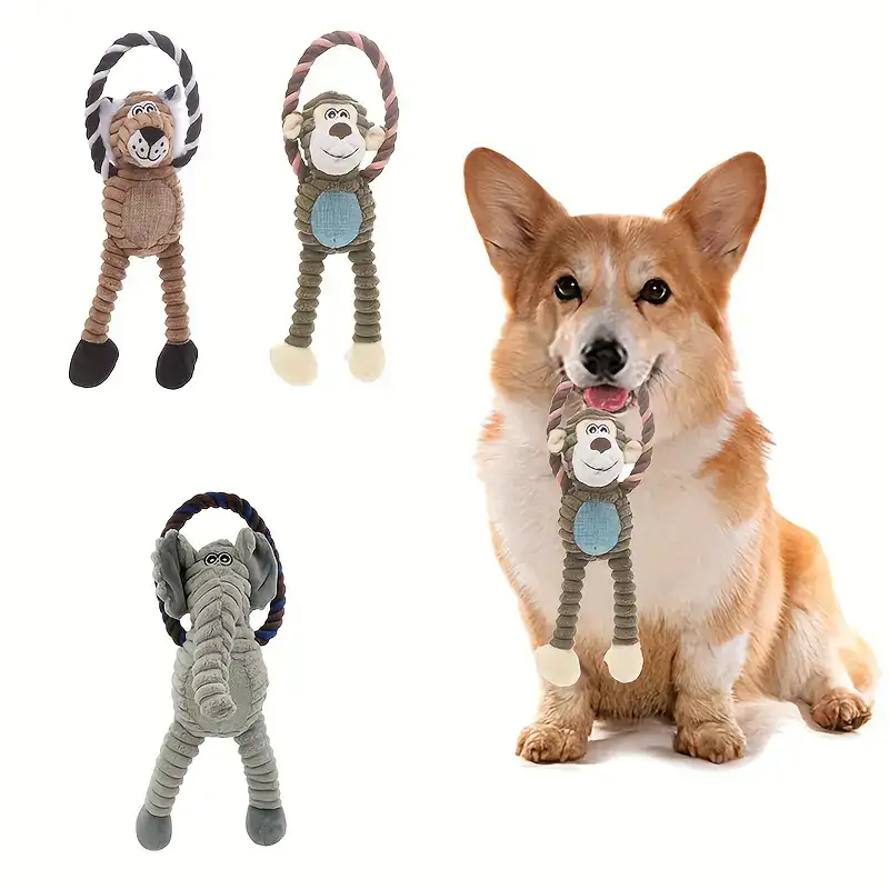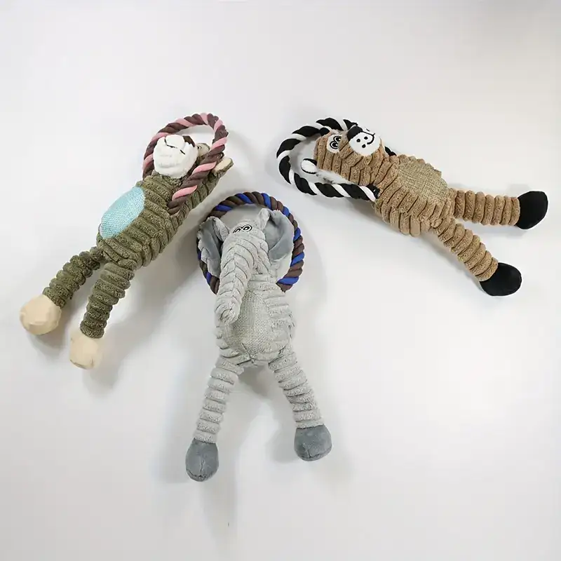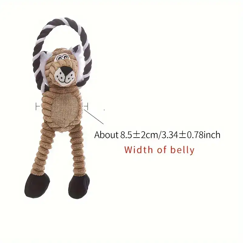 This dog plush chew toy is designed for chewing and interactive play. It features a soft outer body with a reinforced structure intended to help reduce tearing during use. The long-leg shape supports easy grabbing, carrying, and tug-style handling. A built-in ring element adds an additional grip point for controlled play.