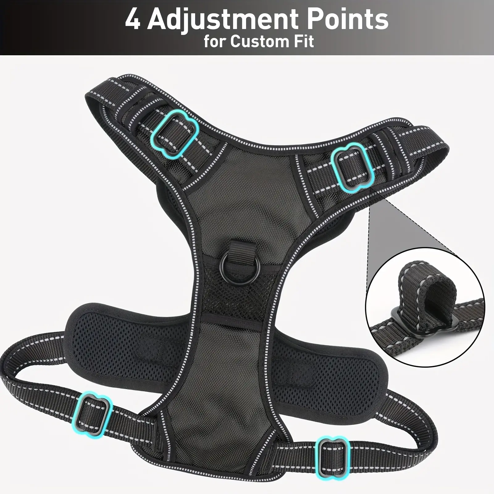 This dog harness is designed to help guide and manage a dog during training and walking. The vest-style shape includes padded sections intended to reduce pressure around the neck area. Two leash attachment points provide options for connecting a leash at the front or back. Reflective trim is included to help increase visibility in low-light conditions.