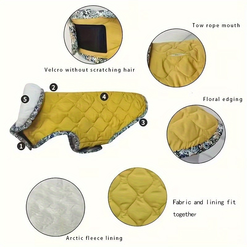 This dog jacket is designed for cold-weather wear with a padded construction and fleece lining. The outer layer is made to help resist light moisture during everyday outdoor use. An adjustable closure design helps support a secure fit across different body shapes. The jacket is intended to be easy to put on and remove for routine wear.