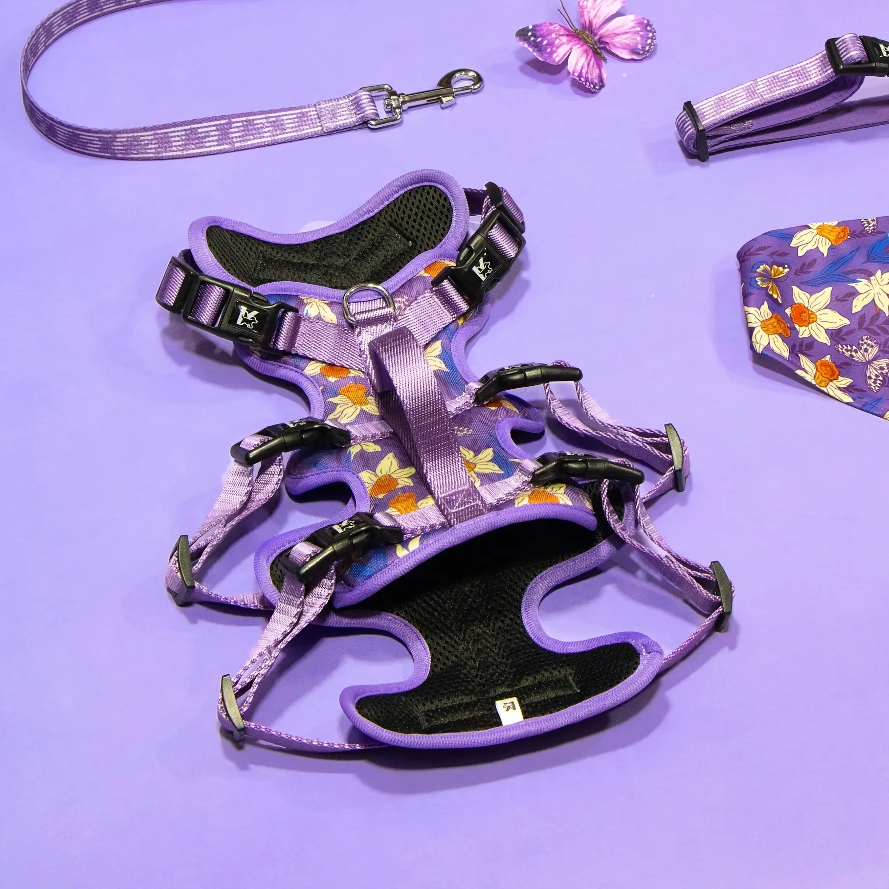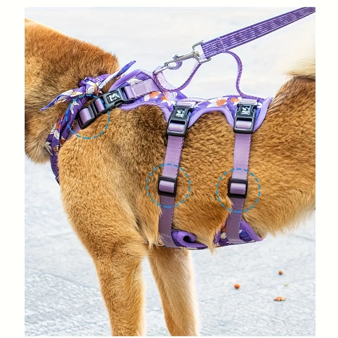 This dog travel harness is designed for walking and restraint during everyday handling. The adjustable length helps you set a closer or looser fit based on your dog’s size. A snug-fit structure is intended to support stable positioning during use. The violet garden-themed design adds a distinct look while keeping the focus on function.