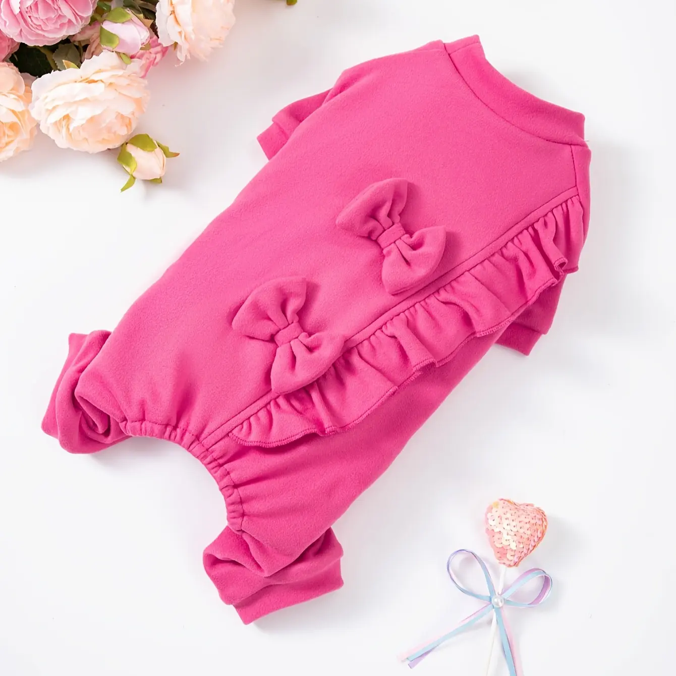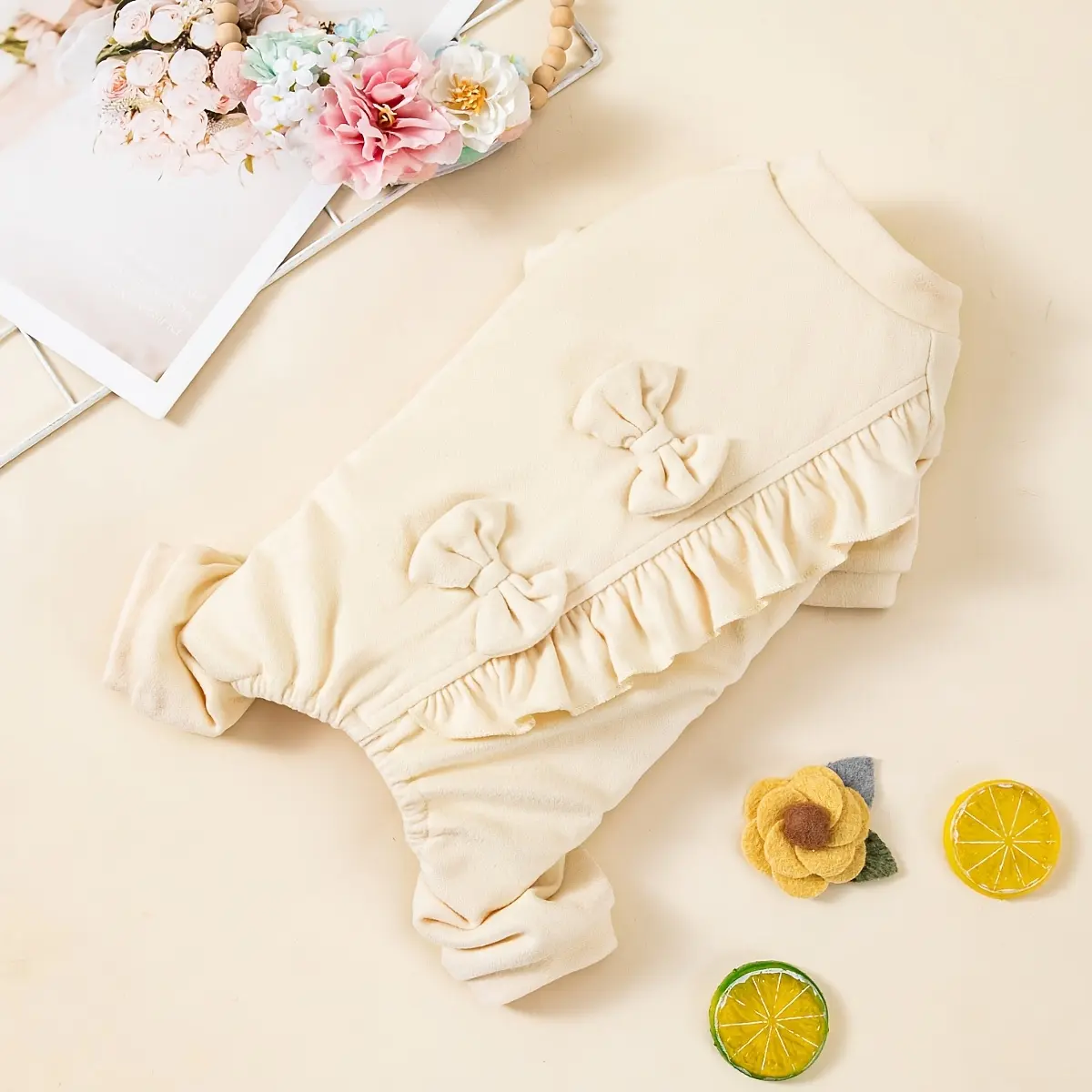 This dog jumpsuit is designed for daily wear and outdoor use in cooler conditions. The one-piece design helps provide consistent coverage while keeping movement straightforward. A velvet-style outer fabric and soft interior feel are intended to support comfortable wear. The bow detail adds a simple decorative finish without changing the overall fit.