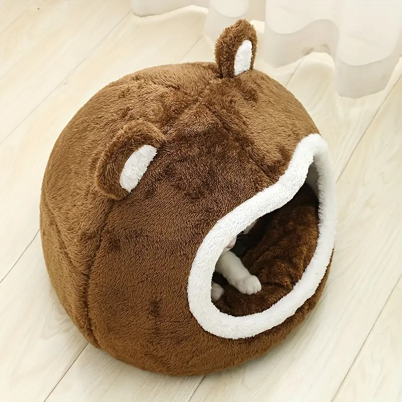 This enclosed pet bed provides a covered resting space for cats and small dogs. The soft cushioned interior supports everyday lounging and sleep. Its tent-style shape helps create a defined area for settling in. Use it as a standalone bed in an indoor environment.