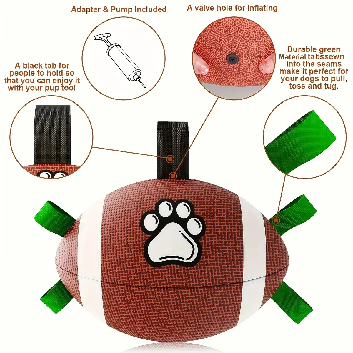 This inflatable rubber dog football is designed for interactive play and chewing. The included air pump helps inflate the ball for use as needed. Its textured paw print surface supports grip during play. The durable rubber construction is intended to handle regular pet use indoors or outdoors.