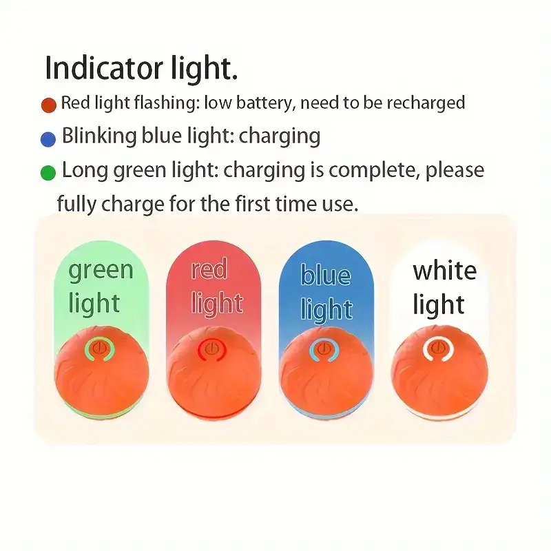 This interactive dog ball toy is designed for self-moving play with rolling and jumping motion. An integrated light element provides visible activity during operation. The enclosed housing is designed to protect internal components during use. Includes a charging cable and user manual for setup and recharging.