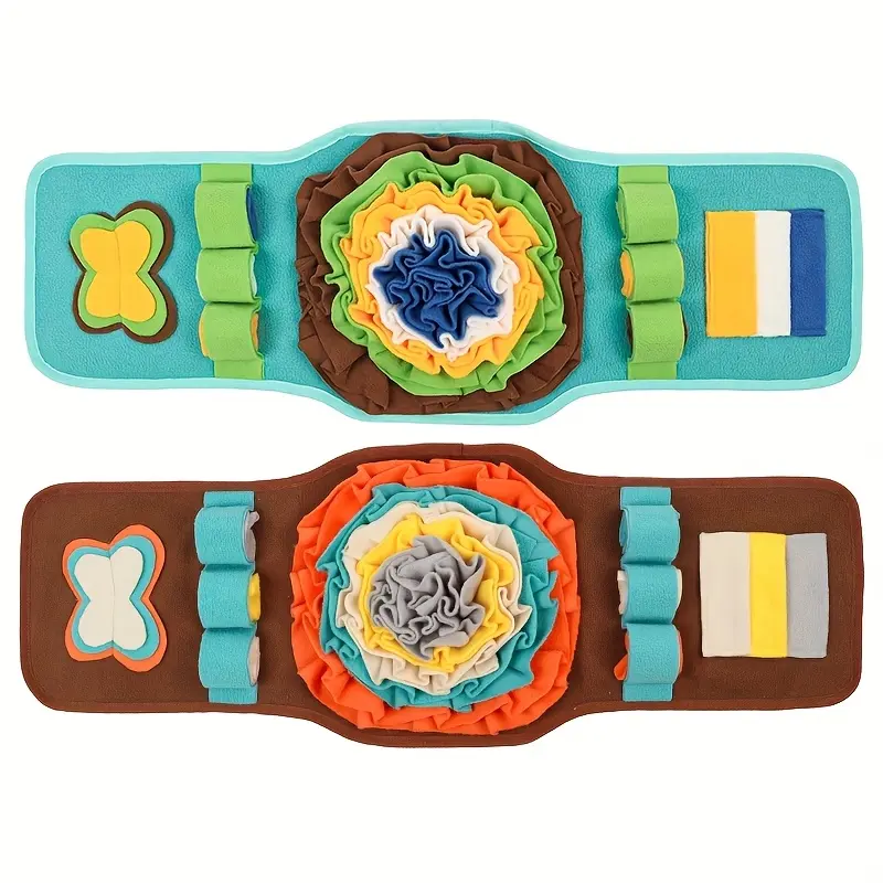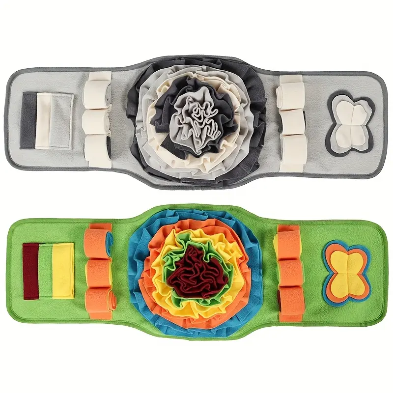 This interactive sniffing pad is designed to hold dry food or treats within a textured surface for nose-led searching. The layered layout helps spread food across the pad to support slower, more controlled eating. A soft, flexible construction allows it to be rolled or folded for storage between uses. Use it as a feeding accessory to add variety to routine meals while keeping setup simple.