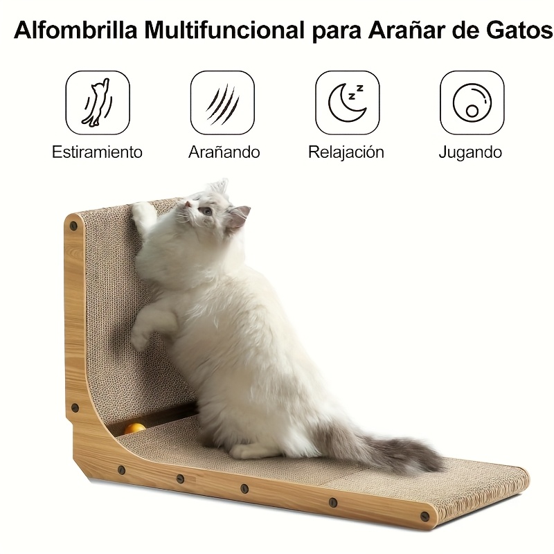This L-shaped cat scratching board is designed to provide a dedicated surface for scratching and claw maintenance. The angled form factor helps create a stable scratching area that can be positioned on indoor floor surfaces. A textured surface supports natural scratching behavior while helping reduce contact with household surfaces. The rigid structure is intended for regular use and simple repositioning as needed.