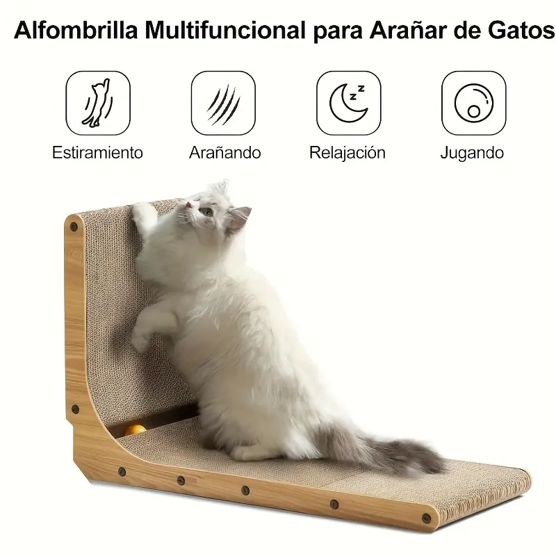 This L-shaped cat scratching board is designed to provide a dedicated surface for scratching and claw maintenance. The angled form factor helps create a stable scratching area that can be positioned on indoor floor surfaces. A textured surface supports natural scratching behavior while helping reduce contact with household surfaces. The rigid structure is intended for regular use and simple repositioning as needed.