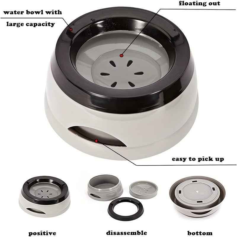 This pet water bowl is designed to help reduce splashing while your pet drinks. A floating disk helps regulate water access to support more controlled drinking. The non-slip base helps keep the bowl steady during use. Suitable for everyday hydration at home or while traveling.