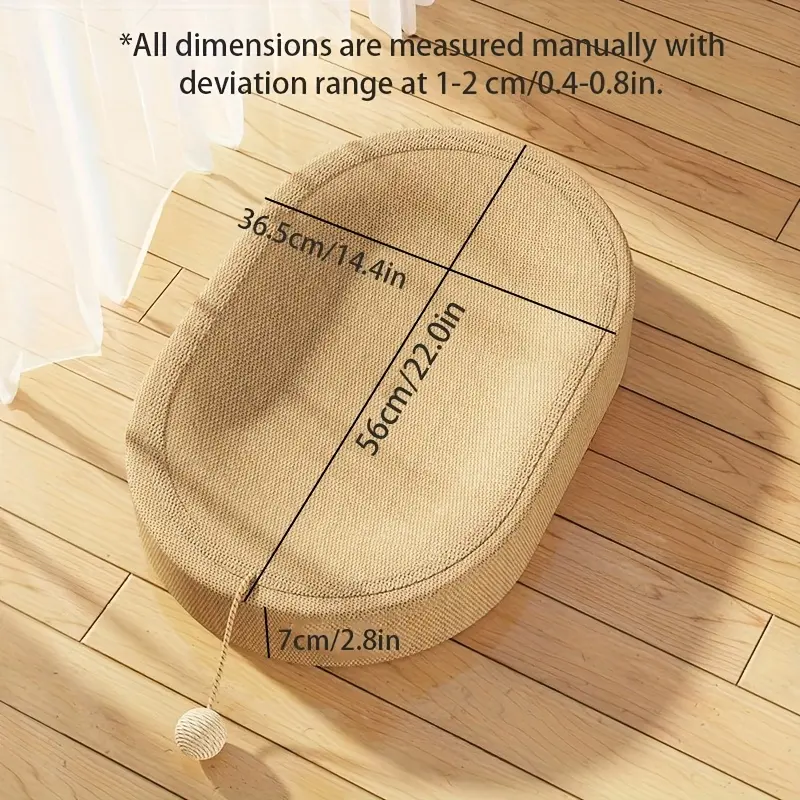 This oval cat scratching board provides a dedicated surface for scratching and daily claw maintenance. The flat board design supports stable use on indoor floor surfaces. A sisal-wrapped surface is intended to help protect household items by offering an alternative scratching area. It includes a hanging toy ball for added interaction during use.