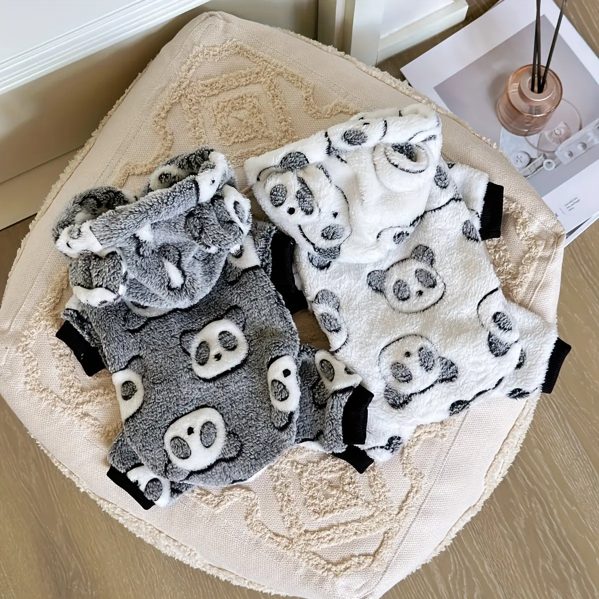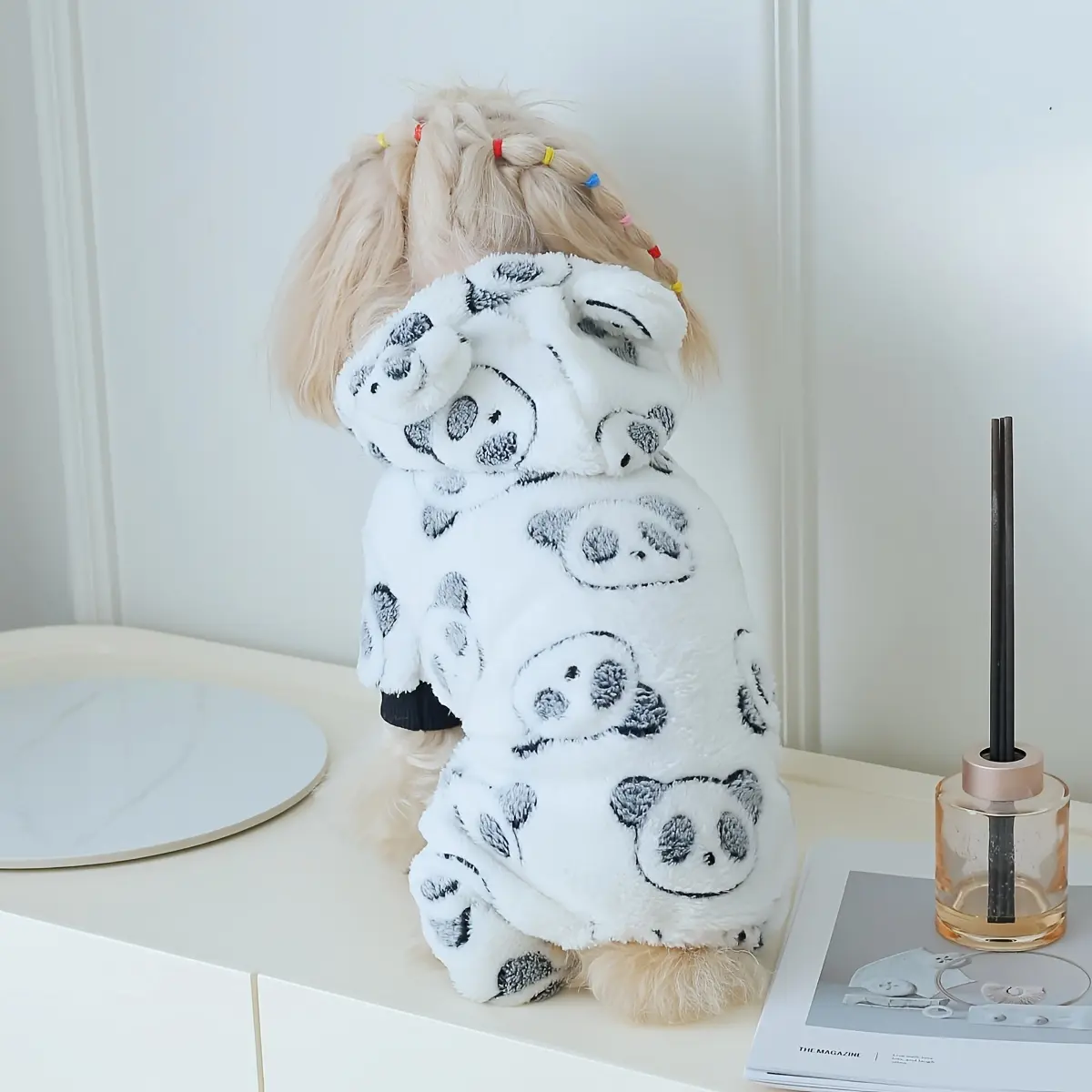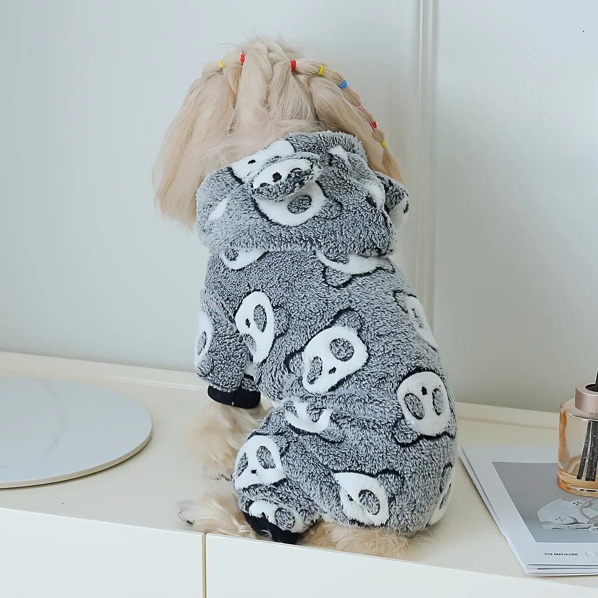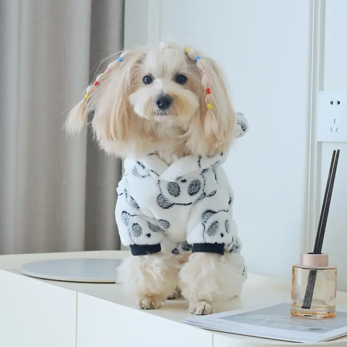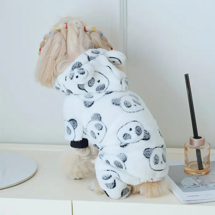This hooded dog jumpsuit is designed for warm wear in cooler weather. The coral fleece construction provides a soft, insulating layer for everyday use. A one-piece design helps provide consistent coverage across the body. The panda-themed styling adds a distinctive look while keeping the fit focused on comfort and mobility.
