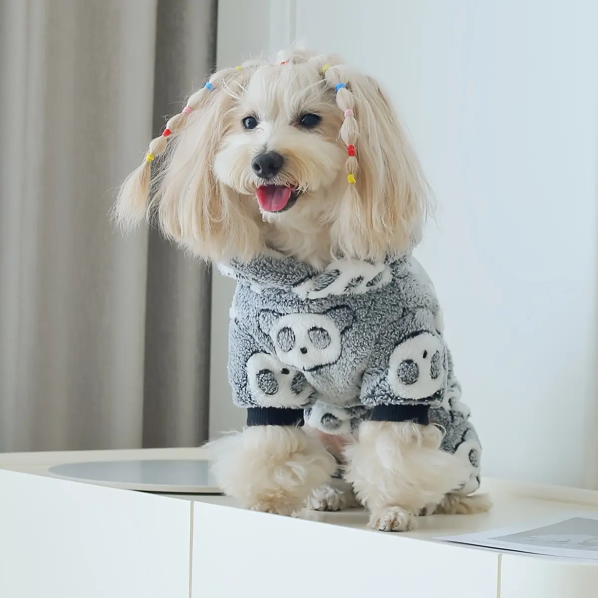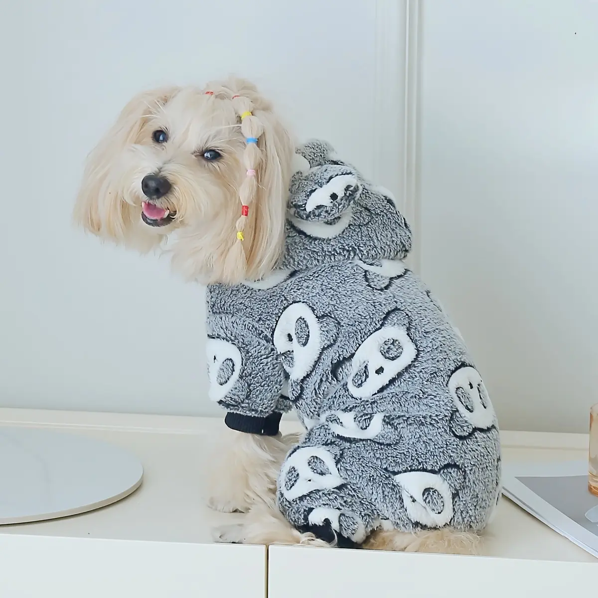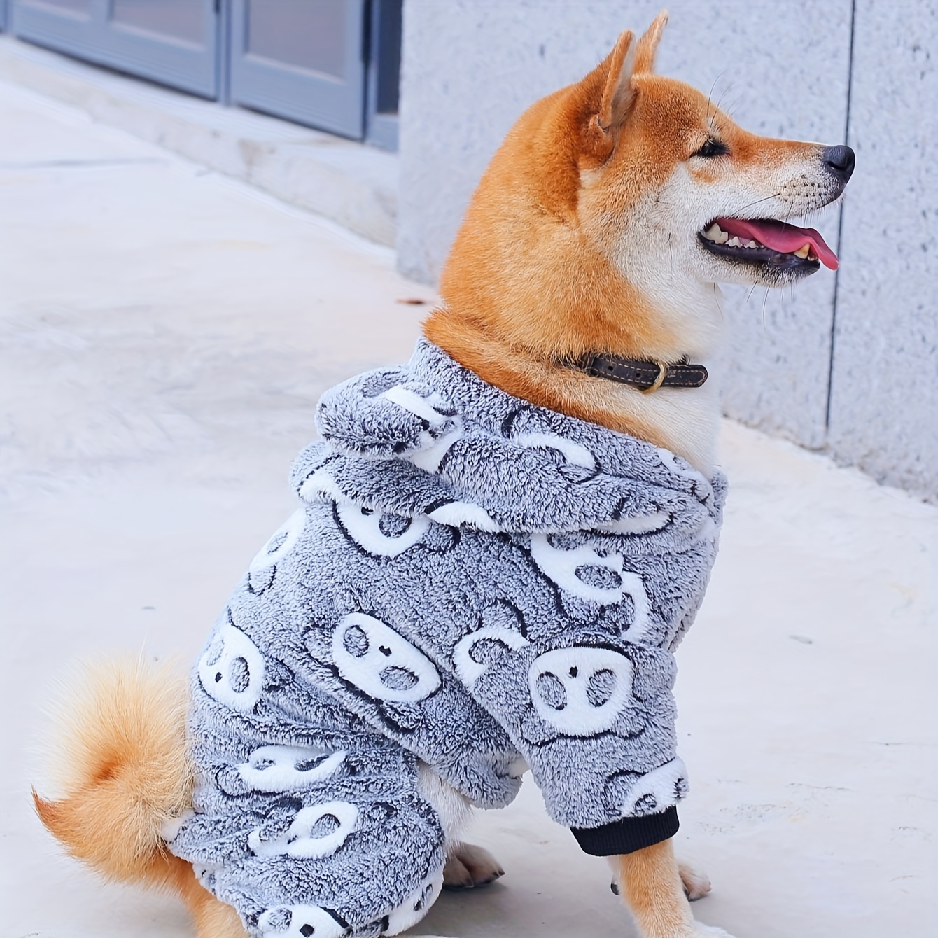This hooded dog jumpsuit is designed for warm wear in cooler weather. The coral fleece construction provides a soft, insulating layer for everyday use. A one-piece design helps provide consistent coverage across the body. The panda-themed styling adds a distinctive look while keeping the fit focused on comfort and mobility.