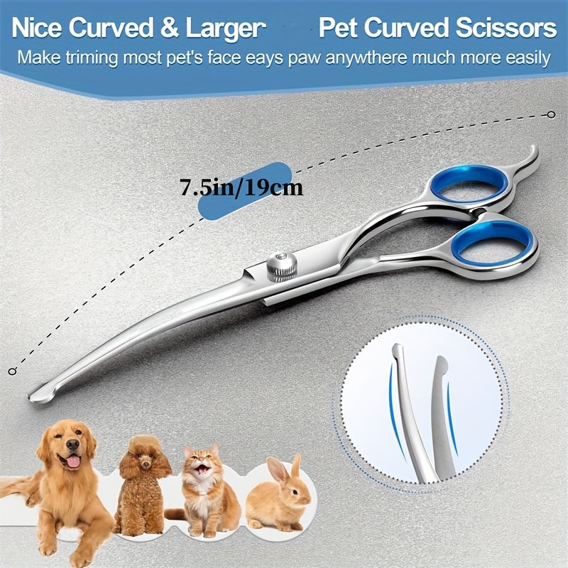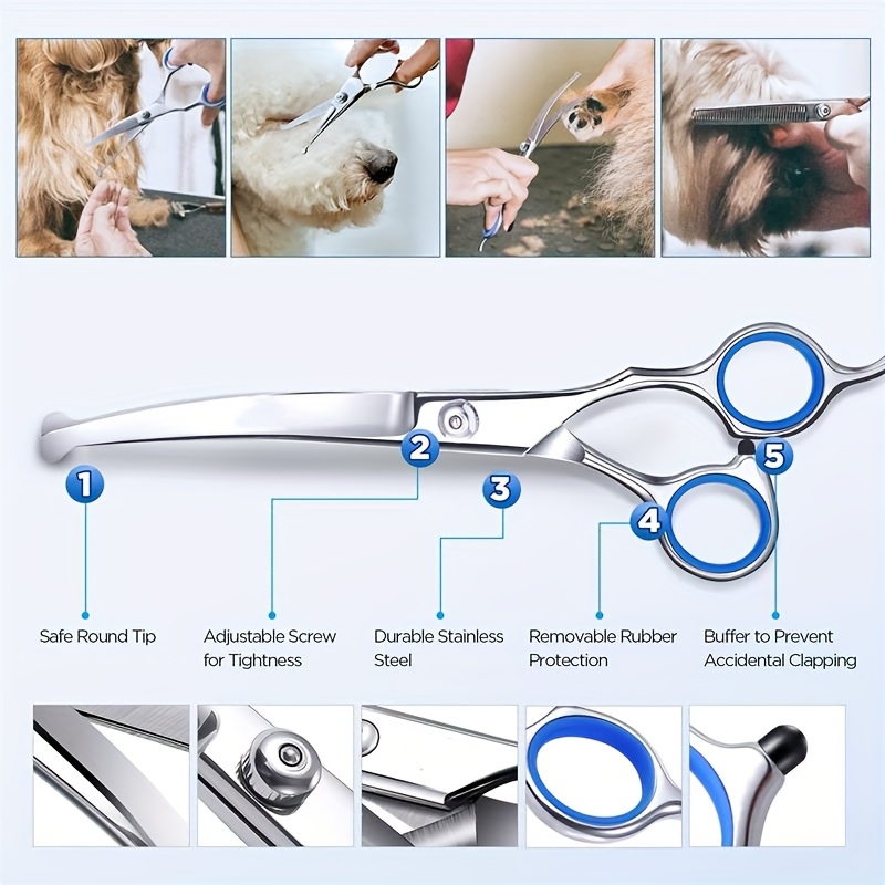 These pet grooming scissors are designed for controlled trimming and grooming of pet coats. The round-tip design helps reduce accidental pokes during close work. Stainless steel construction supports consistent cutting and routine cleaning. An ergonomic handle shape is intended to improve grip and control during use.
