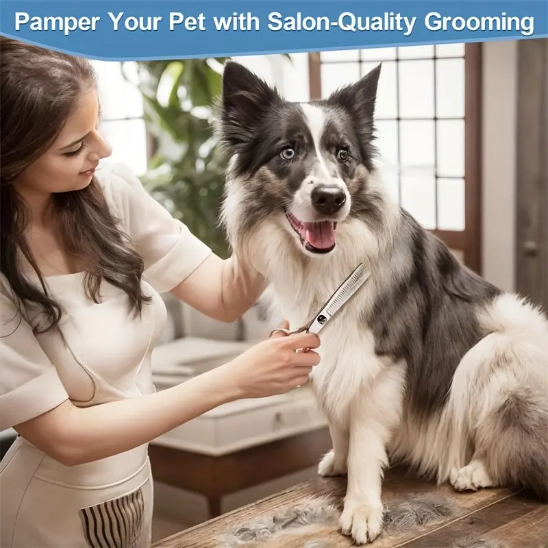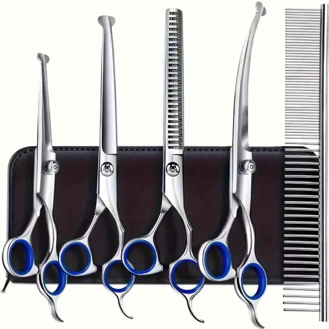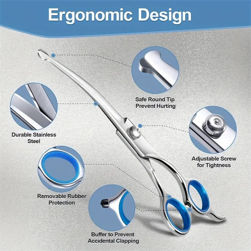 These pet grooming scissors are designed for controlled trimming and grooming of pet coats. The round-tip design helps reduce accidental pokes during close work. Stainless steel construction supports consistent cutting and routine cleaning. An ergonomic handle shape is intended to improve grip and control during use.