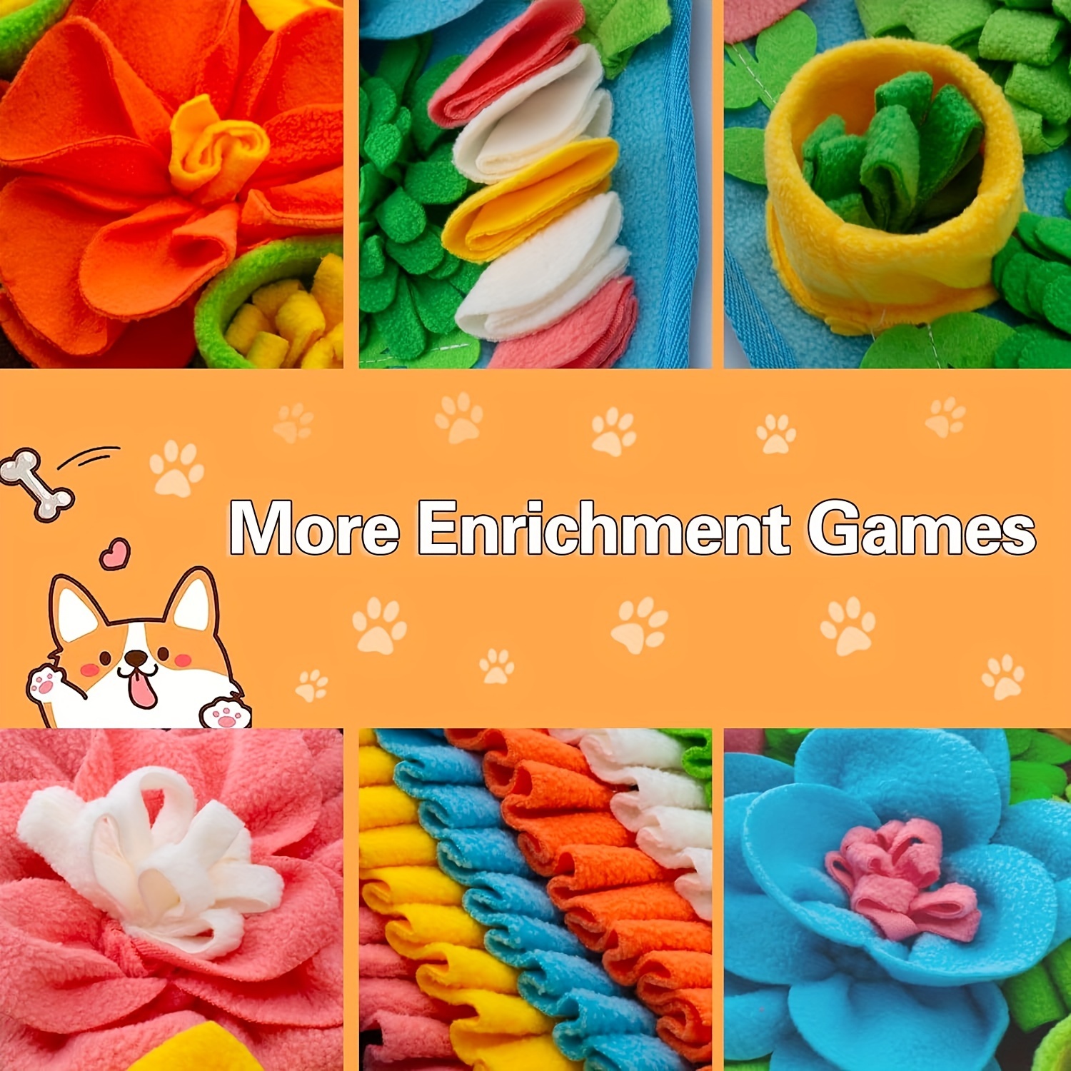 This pet sniffing pad is designed to support slow feeding and interactive puzzle-style engagement. The fabric surface includes folds and pockets that can be used to hide dry food or treats for foraging. A soft, flexible construction allows it to be laid flat for use during feeding time. Suitable for cats and small to medium dogs, with a two-tone color design option.