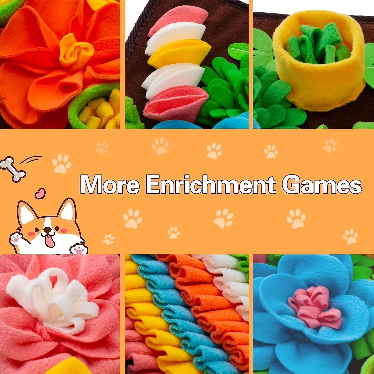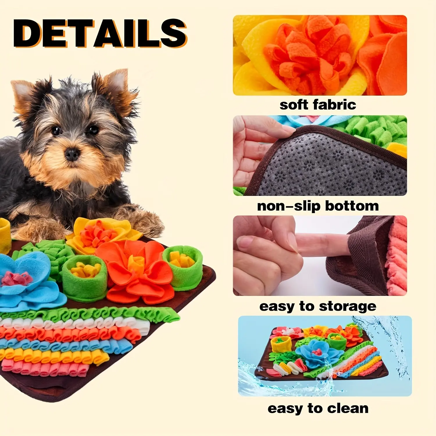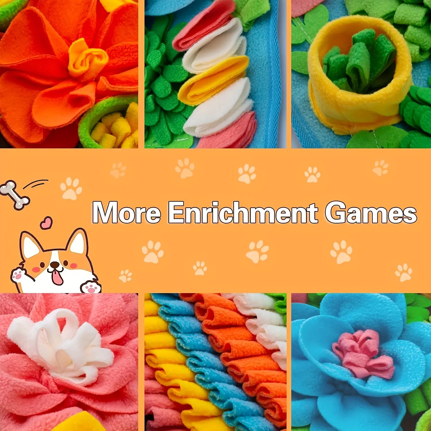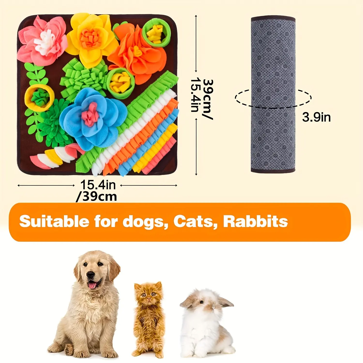 This pet sniffing pad is designed to support slow feeding and interactive puzzle-style engagement. The fabric surface includes folds and pockets that can be used to hide dry food or treats for foraging. A soft, flexible construction allows it to be laid flat for use during feeding time. Suitable for cats and small to medium dogs, with a two-tone color design option.