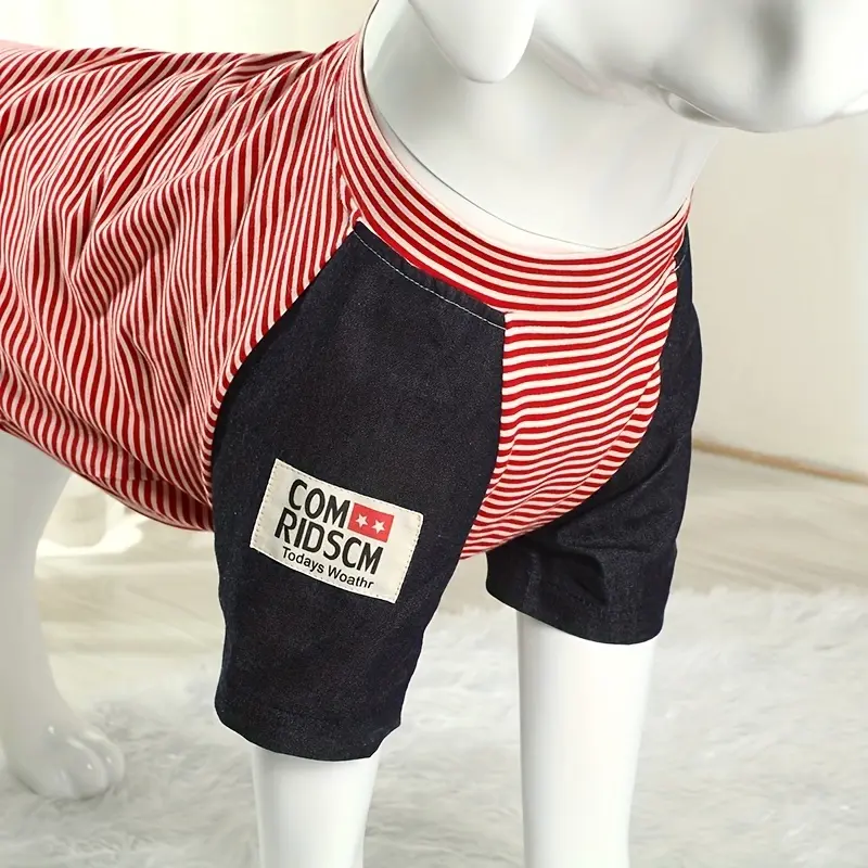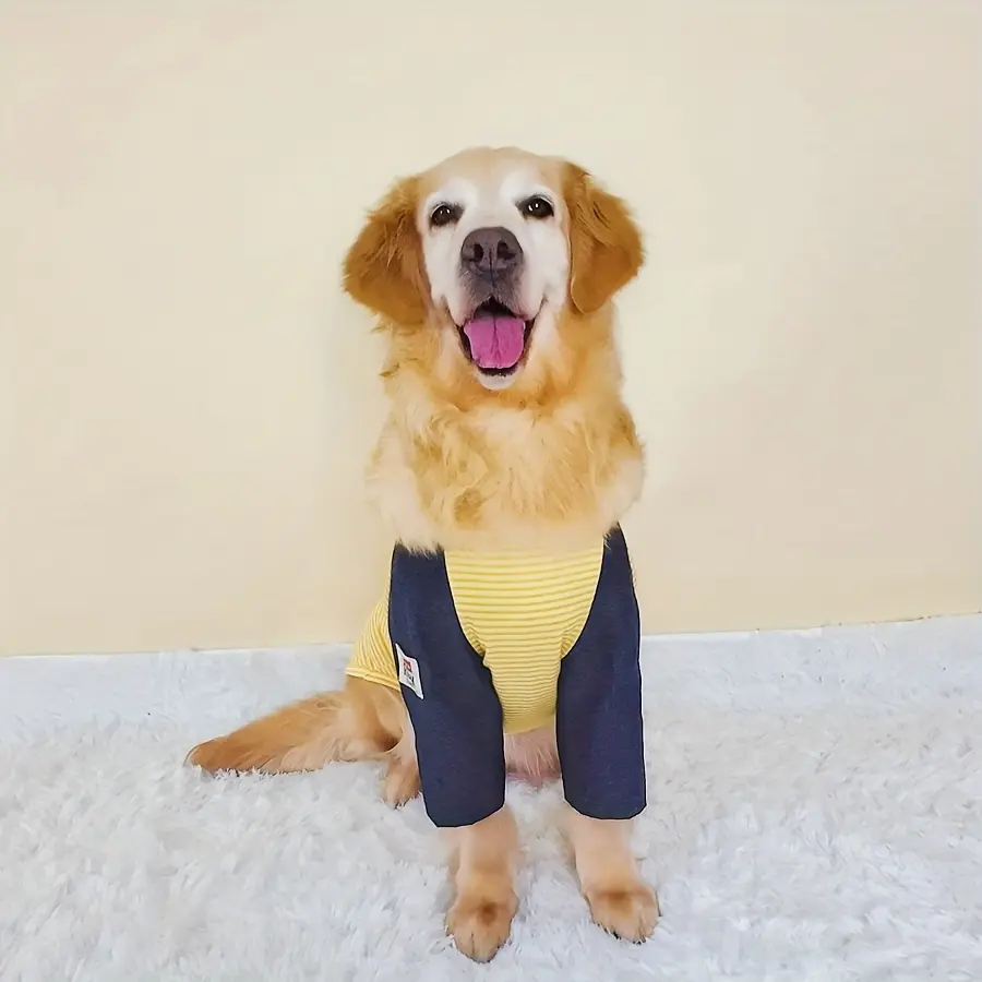 This pet T-shirt is designed for everyday wear for medium and large dogs. The pullover style helps make dressing and removal straightforward. A striped pattern provides a simple, recognizable look. The fabric construction is intended to allow basic movement during normal activity.