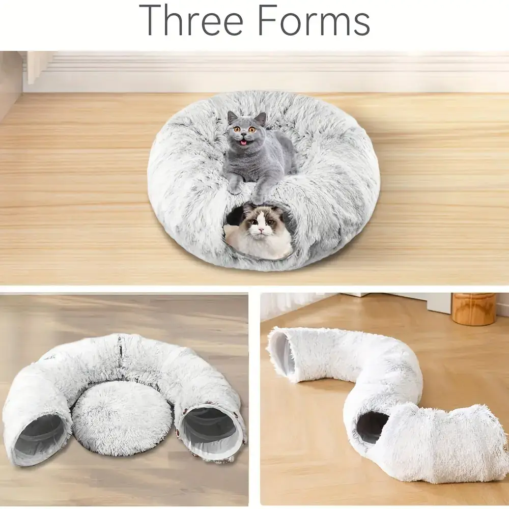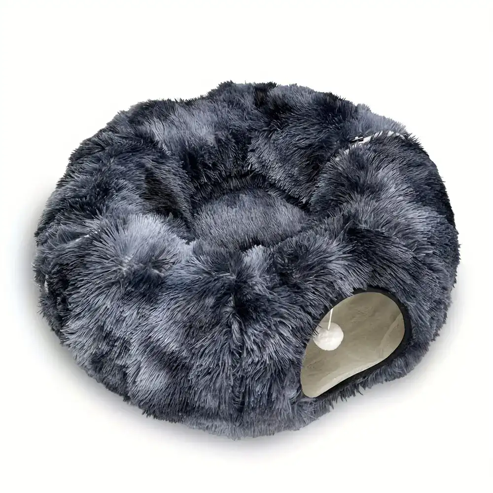 This plush cat tunnel bed combines a resting area with a tunnel-style space for indoor play. The enclosed design creates a covered hideaway with an opening for easy entry and visibility. A soft, padded structure provides a warm surface for lounging. The bottom is designed to stay in place on indoor floor surfaces. Use as a single pet bed that also supports interactive movement through the tunnel.