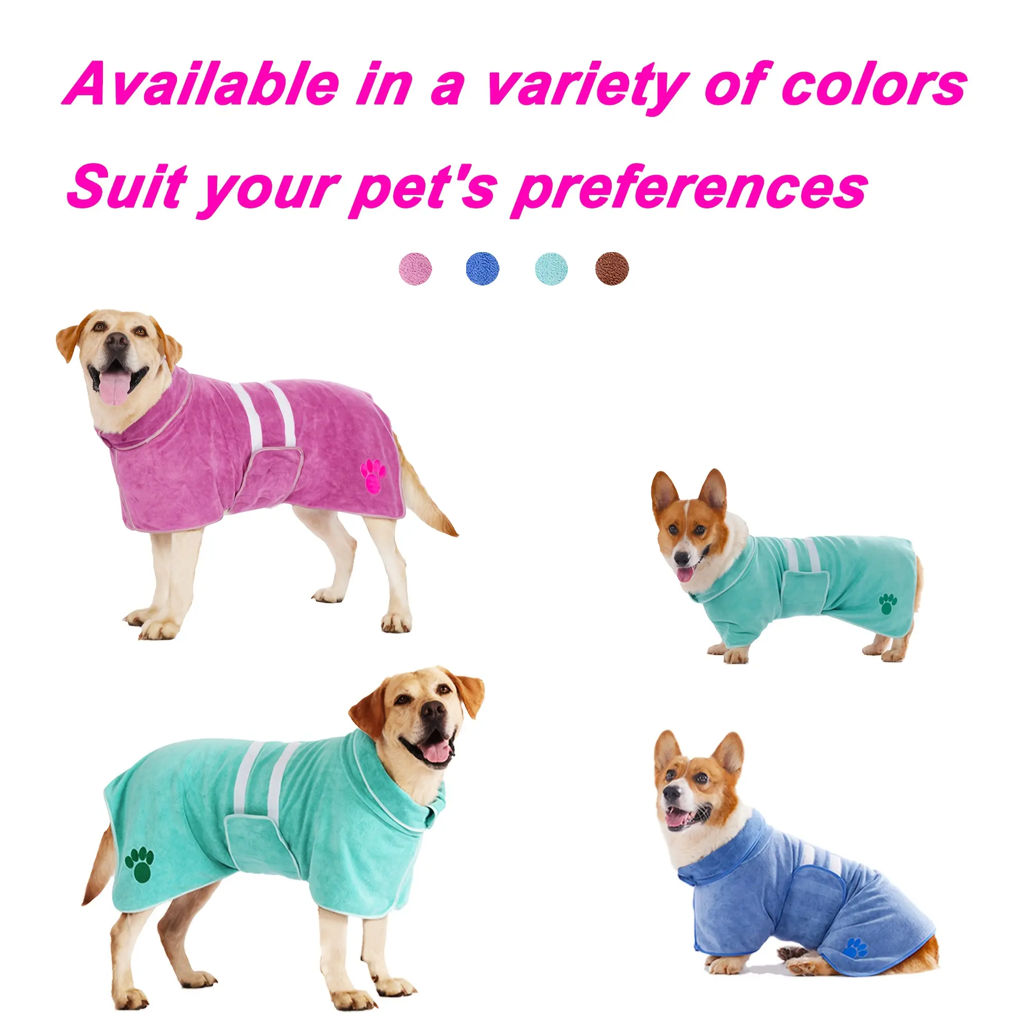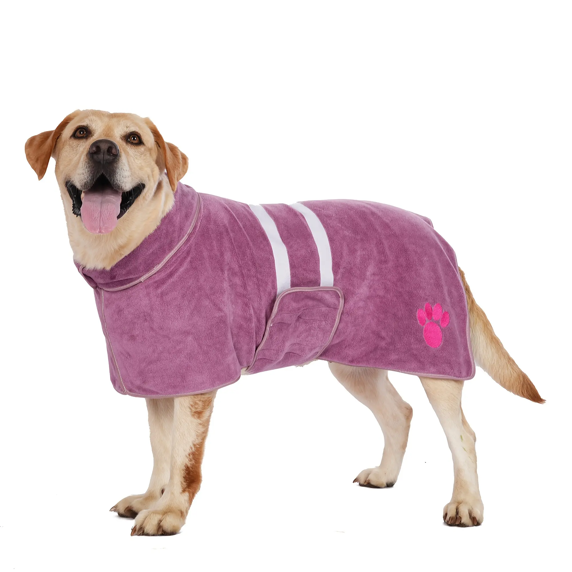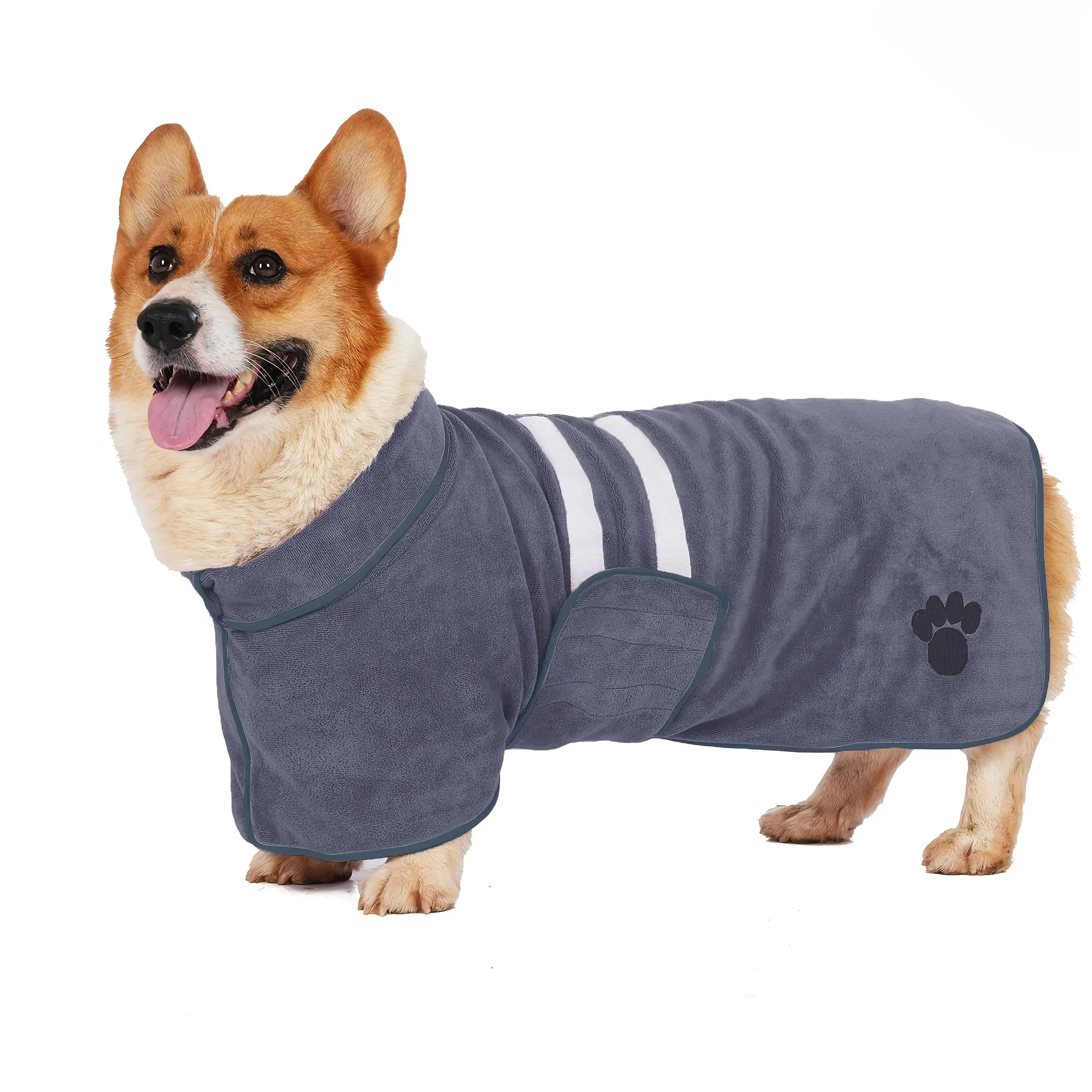 This dog bathrobe is designed to help absorb moisture after bathing or grooming. The adjustable belly strap helps keep the robe in place during wear. Soft fabric provides a comfortable wrap while drying. Embroidered detail adds a finished look without affecting function.