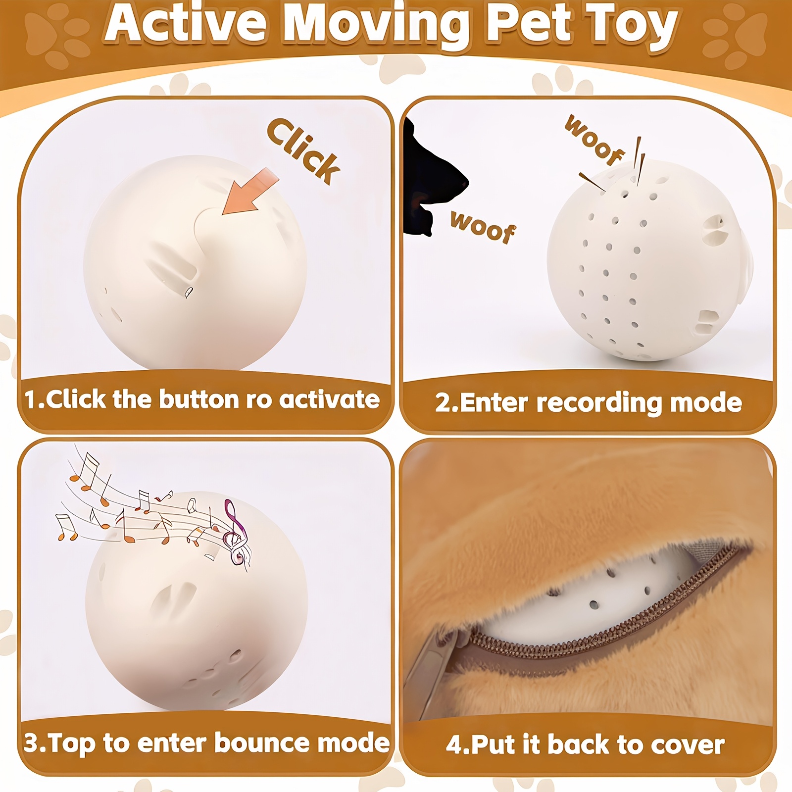 This interactive pet toy ball is designed to bounce and produce sound during play. The rechargeable design supports repeated use without disposable batteries. A washable outer surface helps with routine cleaning after use. Built-in sound and recording modes provide varied play interaction in a compact form.