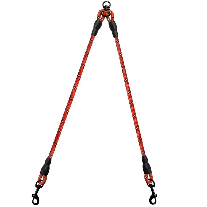 This dual dog leash is designed for walking two dogs with a single handle. A swivel connection helps reduce tangling as dogs move. Reflective detailing is integrated to support visibility in low-light conditions. The handle is shaped for a more comfortable grip during routine walks.