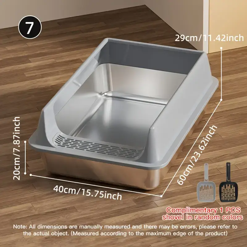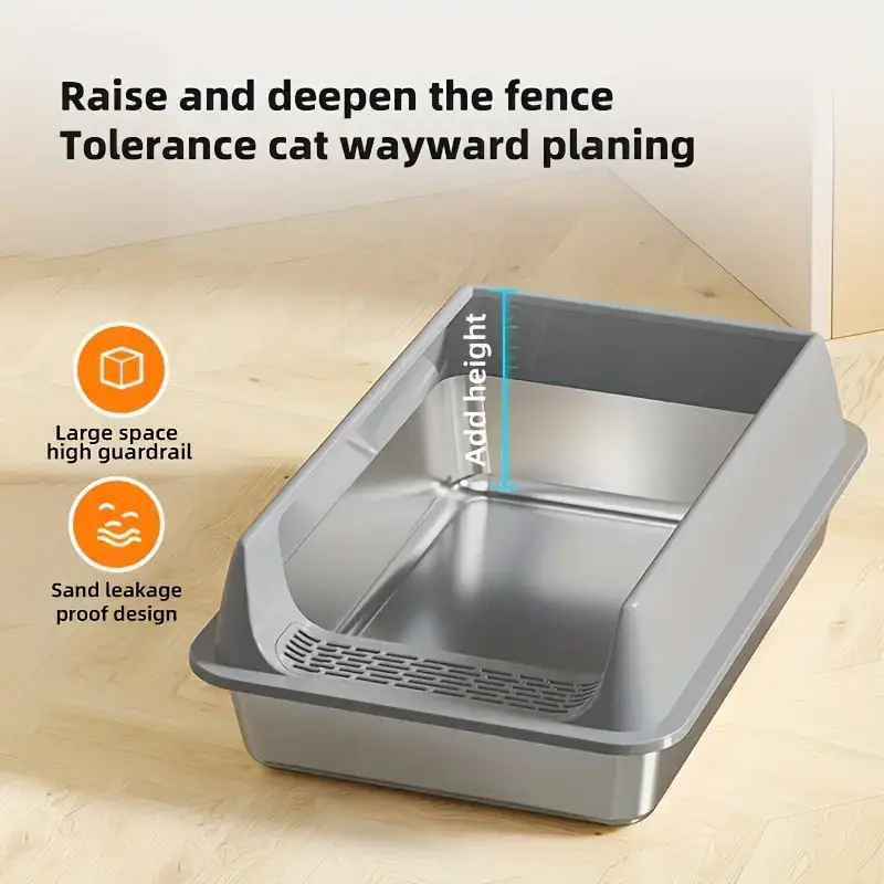This semi-closed cat litter box is designed to help contain litter scatter during daily use. The stainless steel construction provides a rigid, non-porous surface that can be wiped down as needed. A semi-enclosed profile helps reduce tracking while keeping an accessible entry for cats. Includes a matching scoop for routine litter handling and cleanup.